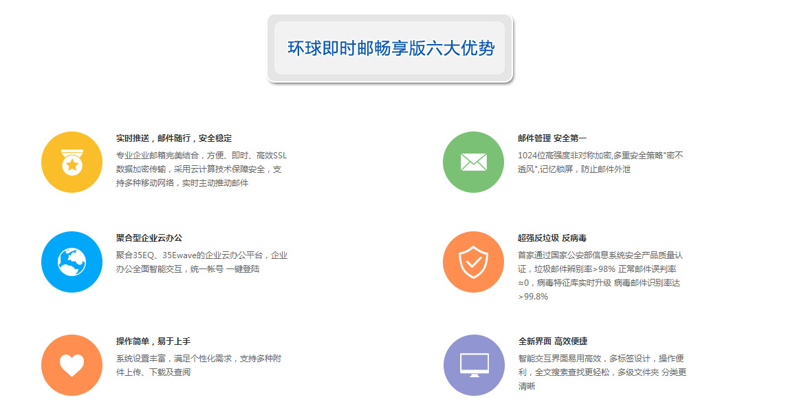 35即時(shí)郵暢享版3.0再創(chuàng)企業(yè)郵局行業(yè)新標(biāo)準(zhǔn)!35即時(shí)郵暢享版擁有目前行業(yè)內(nèi)^高標(biāo)準(zhǔn)的無限空間、G級(jí)附件、整合企業(yè)級(jí)即時(shí)通訊工具35EQ,更精選了多項(xiàng)強(qiáng)勢(shì)功能,全面提升企業(yè)郵局用戶的應(yīng)用及管理等級(jí)。